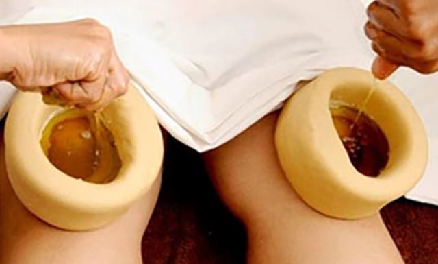This process is almost same as that of Kati Vasti. The only difference is that of place. The well is formed from dough on the knees and filled with warm medicated oils. This is useful in osteoarthritis and provides strength to the connecting muscles, ligaments, cartrilages and the whole joint.