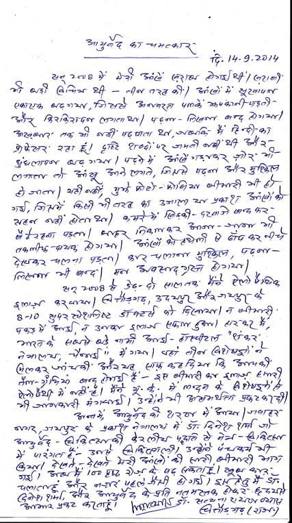 I am a native of Ajmer. 0.44 months ago, I wrote about the treatment of retina disease by Kerala Prati through Daily Oscar and other newspapers, Gatha 1128. I also got the treatment of allopathy done by my son Hemant Kumar Prajapatika during the last five years from Rakesh Porwal, Ajmer, but Got the 1st blood test done without result for about 02 months, after this got the angiography done from Dr. Arun Kshetrapal, Machhari Road, ‘Dr. Punak continued for 0-4 months for Vasu and Aachar “Result was zero, after that 18:13 I did a two month course from Katanagar, Ayurvedic, it helped me get rid of Buddha’s eyes, it made me realize that there is no solid treatment except Ayurvedic. But Muru, my classmates told me that once you showed me to Dr. Manish Nagpal ji of Ahmedabad, who could not treat his daughter, then my father advised us to go to AIIMS hospital or dispute. In the meantime, he met Dr. Khugar, Ramganj, Ajmer, and Retita, specialist Dr. Vineet Pradhan, Jaipur. When he met me, he examined me and asked for medicines and smart tablets. Now I asked him, can Dr. Saheb give proper treatment to the child? He refused by saying that it is God’s will, then I said that you have said that it is God’s will, so whatever hard work we do.