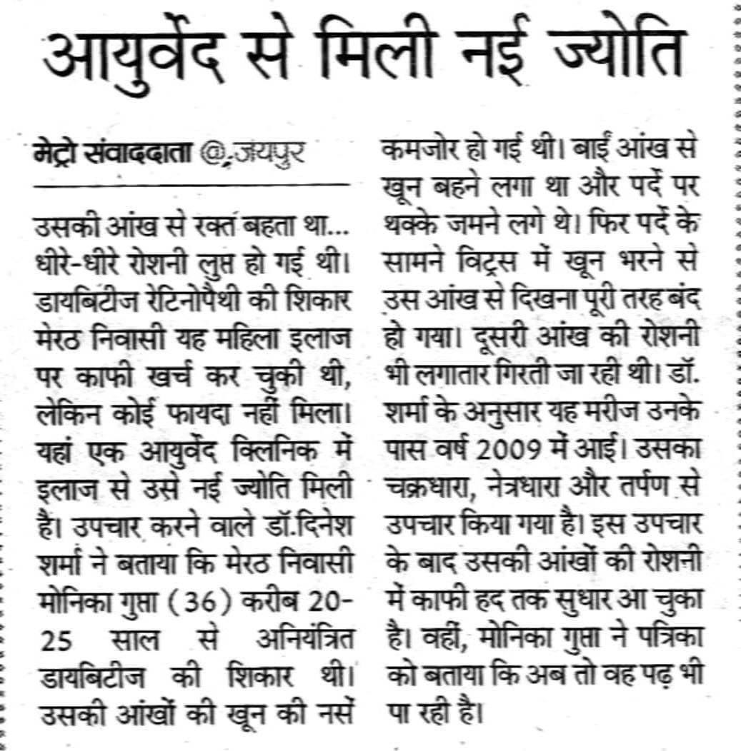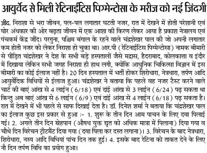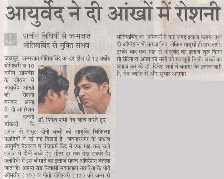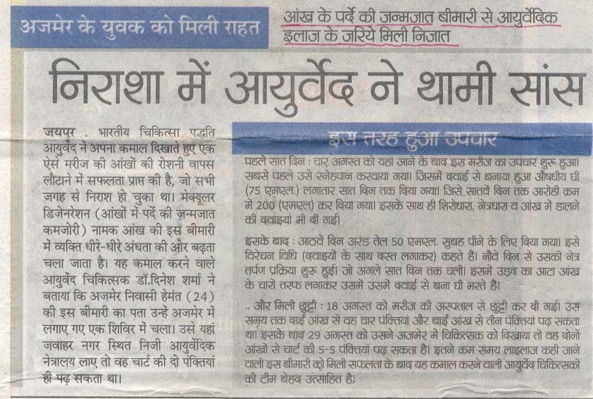 This is a success story of a patient suffering from hereditary disease Macular Degeneration who got relief after taking treatment from Ayurveda. English translation of the same is as under : Indian system of medicine has shown its magic and returned the vision of such a patient who was disappointed from every place for his vision. Macular Degeneration is a genetic disease in which patient approaches blindness gradually. Dr. Dinesh Sharma, An Ayurvedic Eye Specialist who did this magical deed told that he came to know about Hemant’s disease in a medical camp held at Ajmer. He advised the patient to come to his Ayurvedic eye hospital at Jawahar Nagar, Jaipur, Rajasthan. There after examination, he found that the patient can read only 2 lines of the vision chart.
